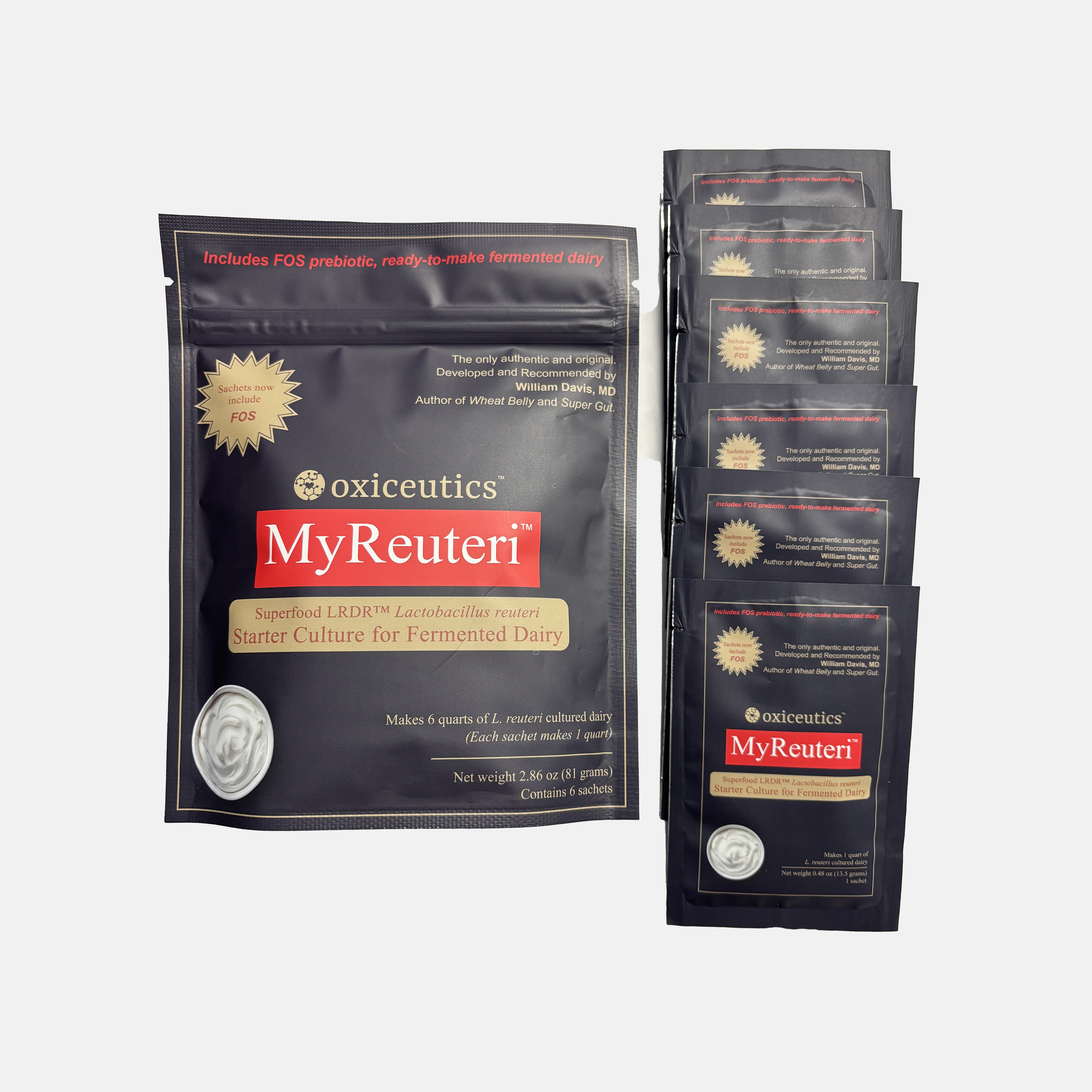 Each single-use sachet contains Lactobacillus reuteri LRDR™ (live culture) and 13 g FOS (2 tablespoons), plus a small amount of anti-caking agent (silicon dioxide). It is intended for preparing yogurt-like cultured dairy at home.